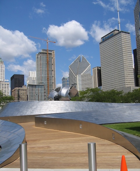 And, off I went! I Xeroxed the Loop map out of Access Chicago so I might look a tad less touristy, and made my way by taxi across the river. I started in the northeast corner of the Loop at the Illinois Center (a large project that Mies contributed to), from which I would make a large arc south then west through the city streets to the Sears Tower. (I figured that would be a good ending destination since cabs should be pretty easy to find there.) Illinois Center confused me; apparently it's more of a designation for a complex than a particular building or set of buildings. More like "San Diego" than "Empire State Building." So, I snapped a few shots of anything that looked Mies-ish (for Dad; must have proof!) and wandered towards Grant Park. The park is actually several outdoor venues linked together, like Richard M. Daley Bicentennial Plaza and the Clarence Buckingham Fountain and Millennium Park. Technically, it even includes the Art Intitute of Chicago. If I'd had more time, I'd have liked to see the fountain, because it's the really famous one, best known (lamentably) for opening Married: With Children. But I saw it in '96, so no huge loss. I focused most of my time on Millennium Park, because they're nearing completion of a big, whooshy Frank Gehry building there, which resembles the art museum in Bilbao or the new Walt Disney Concert Hall here in L.A. It starts with a sort of band shell type thing at the north end of the park and then sprawls out with these tubular tentacles southward down the lawn. There's also a very shiny pedestrian bridge made out of more curvy metal panels; I'm surprised they let him keep putting those things in cities after all the fuss over the Disney hall heating up nearby apartments as much as 15 degrees due to its reflectivity in the heat of the day.