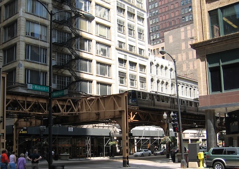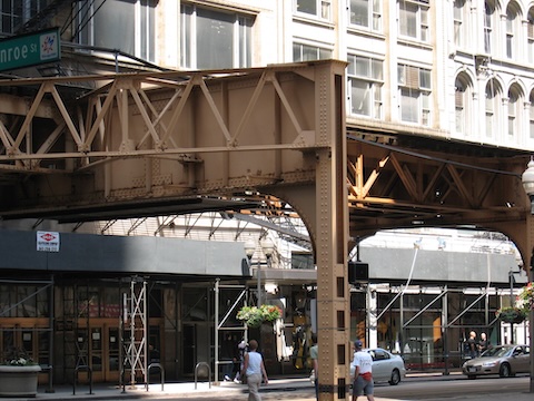 After that, I made my way into the concrete jungle, which became noticeably cooler very quickly. All that shade and wind tunnel effect – delightful! The next few architectural highlights on my tour were less recognizable, but interesting and historical in their way. Unfortunately, a couple were undergoing some sort of renovation/restoration, so they had that first-floor scaffolding cave thing going on that you get in big cities a lot. Sadly, the Chicago Board of Trade was closed; that was one I had really wanted to go into because of the really interesting atrium illustrated in Access Chicago. No photologue of Chicago would be complete, however, without at least one picture of an "El" train. I really liked the interplay of light and shadow created by the buildings and tracks here, which sadly I managed to capture more effectively when the train wasn't there. Part of my ambition with carrying the new camera around (still ensplotched, by the way – Canon will get another go at it once I'm back from my trip next week) and snapping more pictures is that as many as possible will say something or at least show some creative or artistic merit. I took a photography class; I graduated film school; I work in design. I'm told I have a good "eye" (Robert Wuhl would say I have two), so it shouldn't be too hard to take "good" pictures. Just something that is more interesting than "this is a photographic document of that thing." Of course, I've really challenged myself right out of the gate by focusing on architecture and sightseeing as my first major project. (And simultaneously!) Overall, I'd say the results are okay. A few shots really make me happy, a few others are interesting, many more are recognizably creative if you'd been there and seen what the obvious choices would have been, but on their own they look sort of blah. And plenty are just photographic documents of places. By necessity, most of the ones featured here are the latter type, because I'm describing the trip and they serve that purpose best. But I picked the "artistic" one of the 37signals staircase because I like it a lot, and I'm featuring two pictures of the El track, one "Hey! An El train!" and one "Oooh, interplay of light and shadow."