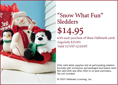 Over the holidays, Hallmark was offering a little robotic plush trinket called "Snow What Fun" for $25 (or $15 if you bought three cards). It represents a snowman, a penguin, and a puppy, preposterously out of proportion, riding a sled along a snow bank. If you clap or squeeze or activate it in some fashion, it plays a little tune and the three characters dance.